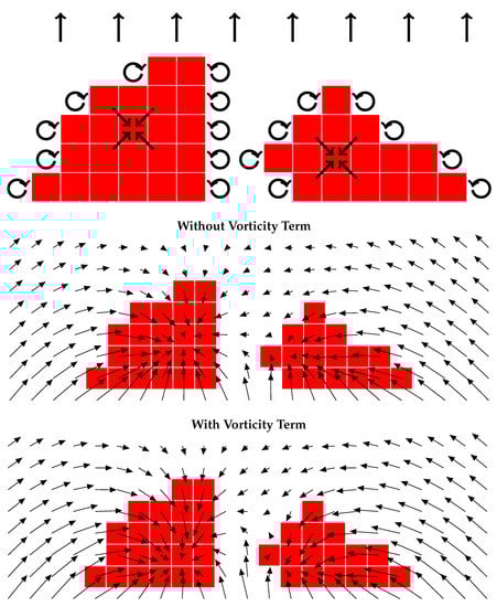 where represents vorticity sources. Fire-induced vorticity is an active area of investigation, and we focus on a simplified model for vorticity that is only present in the two-dimensional plane. At the flanks of the fire, we impose a vorticity source that is clockwise at the left flanks and counterclockwise at the right flanks. These vortical forces are placed along the entire flanks, including between broken fire lines (Figure 1). We also consider vortical flows that are counterclockwise on the left flanks and clockwise on the right flanks. This vorticity occurs when the shear direction above the fire is reversed by strong fire regions, and the result is what Clark et al. referred to as dynamic fingering [].