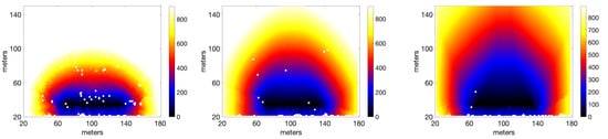 We next consider a junction ignition pattern with three different opening angles: , , and . In Figure 7, we compute the first arrival for each of these ignition patterns. In all three examples, the background wind is m/s, , , and the burn time is s. By applying Equation (6), we use the first arrival time to define a rate of spread along the line that bisects the two flanks, which is also parallel to the background wind direction (Figure 8). As expected, we see that smaller initial junction angles result in faster rates of spread.