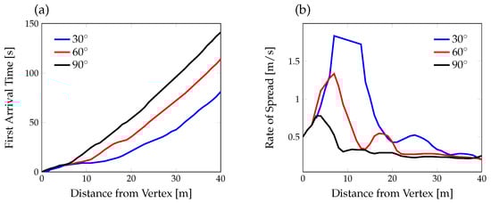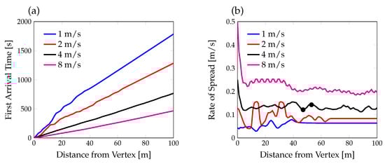 (a) The first arrival time along the horizontal line that passes through the ignition pattern. Heat maps of the first arrival time are in Figure 9. (b) The rate of spread, defined using (6), along the horizontal line passing through the ignition pattern. The rate of spread is only reported for the right-moving flank, and the left-moving flank has a similar trend.