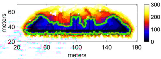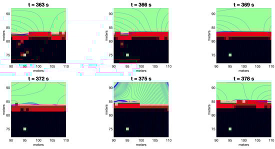 As a final example, we consider a head fire that is sufficiently intense that the background vorticity field is set by the inflow or the dynamic fingering case. Therefore, the induced vortex flow rotates counterclockwise on left flanks and clockwise on right flanks. In this situation, the vorticity promotes fingering, some of which develop into new head fires. Using our model, we are able to observe this behavior under various conditions. Somewhat heavier fuels and a strong sink so that fingers do not rapidly diverge from the main fire line destabilize the front and promote multiple head fires. In the case of a moderate wind speed m/s, a strong negative vortical velocity , and a sink velocity , the head breaks into roughly four smaller head fires (Figure 11). Here, we also increase the burn time to s, and with the presence of the random diffusion term, this increases the probability of a finger forming. Finally, the length of the initial fire line is increased to 135 m so that additional heads have the potential to form. In Figure 11, we plot the first arrival time for the first 300 s. We see that at early times, near s, the initially uniform fire line splits into about six separate head fires (green contour) that merge to form four major head fires at later times.
