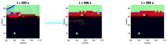 Our model produces periods of faster and slower rates of spread, and two such instances are indicated by the black dots in Figure 4b. The configurations of the system at these locations are plotted in Figure 5 (slow rate of spread) and Figure 6 (fast rate of spread). In the slow case, the fire line near m is sufficiently wide that the convective sink does not allow heat to be advected away from the fire, as is indicated by the streamlines, and this persists for 15 s. The resulting rate of spread is about m/s. It is only once the fire line thins due to burnout that the convective sink weakens, and the head is finally able to propagate forward. In contrast, in the fast case, the fire line near m is thinner, and the result is that the fire propagates two cells forward in 6 s, resulting in a larger rate of spread of 0.14 m/s.