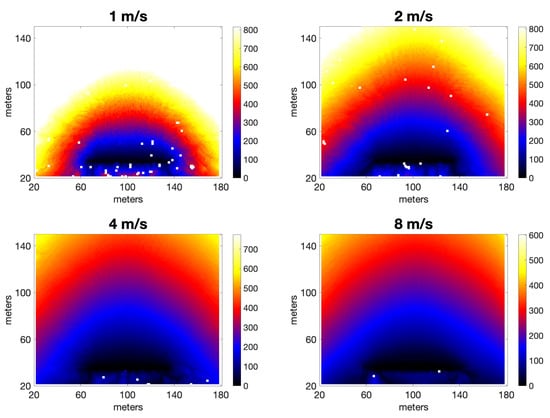 We examine the effect of vorticity on a head fire, starting with the effect of positive vorticity in a weak convective sink environment. For each background wind speed , the dimensionless sink and vortical velocities are and , respectively. Therefore, the convective sink velocity is 100 times smaller than the vortical velocity. For all simulations, we use the burn time of s. As discussed in Section 3.1, a head fire is ignited at m, and it is initially 66 m-wide and 1 m-thick. In Figure 9, we plot the first arrival time for four different wind speeds. This first arrival time is calculated along the horizontal line going through the ignition line, and is plotted in Figure 10a. Even though the spread includes a random term that breaks symmetry, the rates of spread of the two flanks are comparable. Therefore, we only plot the lateral rate of spread of the right flank in Figure 10b.