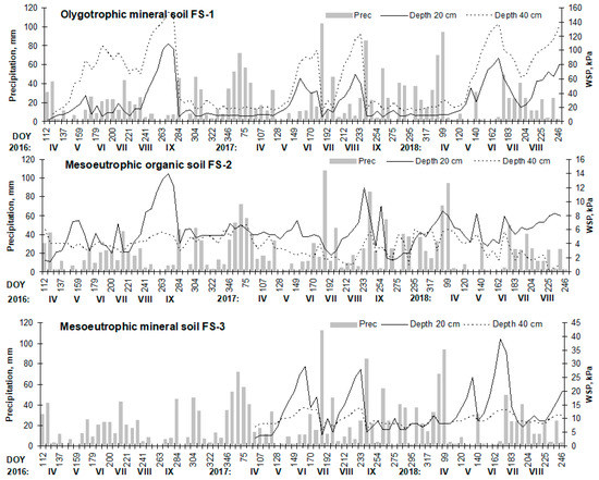 Data on soil water potential suitably reflected periods with sufficient humidity in the soil and periods with a lack of moisture, that is, drought periods (Figure 2). Soil water potential at a depth of 40 cm was higher than that at depths of 10 and 20 cm and, in general, agreed well with the precipitation amount at all FS.