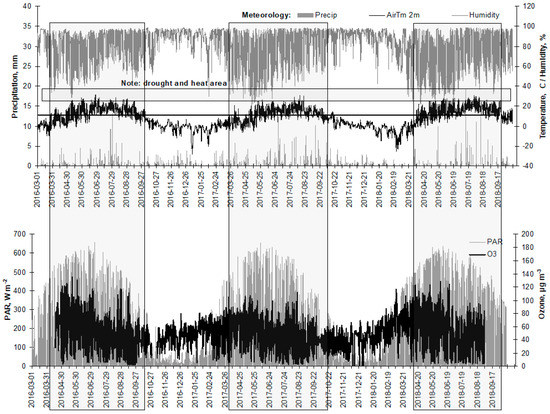 Values of the main meteorological parameters (precipitation, mm per h; temperature, °C; humidity, %) and sun radiation (photo synthetically active radiation, W m−2 and surface ozone, µg m−3) on hourly scale in Aukstaitija IMS, 2016–2018. Periods when mean temperature exceeded 5 °C are in box.