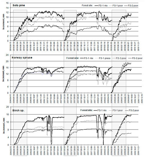 The results obtained on the balance of stem BA shrinking and swelling at the diurnal scale were rather surprising. Spruce trees demonstrated the greatest decrease in stem BA during the daytime and the greatest increase during the nighttime at both FSs. An approximately twofold lower reduction and increase in stem BA were recorded for pine trees during these time periods and only birch stem BA shrinking and swelling processes were close to zero. At organic soil FS-2, the intensity of these processes was less expressed for all considered tree species than at mineral soils FS-1. There, spruce stem BA swelling was significantly higher than shrinking, which indicated that, even during drought episodes, more humid site conditions were more favorable for spruce tree growth than for pine and birch tree growth.