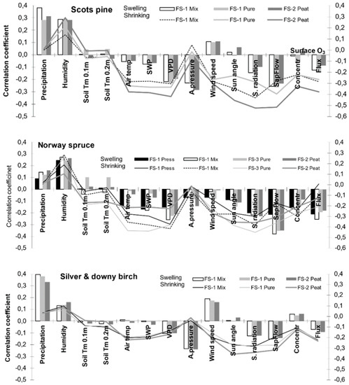 Pine trees also demonstrated a very sensitive reaction to environmental changes. Their stem shrinking and swelling processes in general were most expressed during the entire vegetation period. The highest reversible fluctuations in water storage in xylem, phloem and bark did not mask the signal caused by wood formation, which has been referred to by many authors [62,63,80,81], and this is why this species became most sensitive to changes in meteorology and air pollutants including surface ozone in the northeastern part of Europe. The considered meteorological parameters explained the variation in both stem shrinking and swelling most significantly. These results contradict the findings obtained in Central or Southern Europe, where the increment of Scots pine was least sensitive to environmental changes and differed least between different growth conditions [27]. Our data obtained earlier indicated that meteorology and acidifying compounds explained the variation in annual pine tree ring width most significantly [56,57,58]. On an hourly scale, temperature, precipitation, humidity, sun activity and surface ozone play a major role in pine intra-annual tree ring width formation, confirming our data obtained on annual pine increment.