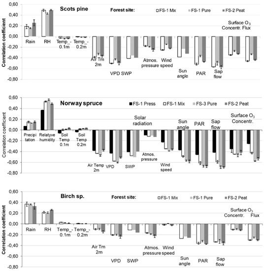 Notwithstanding this, in this study I tried to better understand how the daily stem radial activity of the prevailing forest tree species in Lithuania—Scots pine, Norway spruce and silver and downy birch were affected by variations in relative humidity, air temperature, solar radiation, wind speed and SWP as well as VPD. Special attention was paid to surface ozone concentrations and their fluxes through the stomata, which were detected by analyzing tree sap flow data. These data related to the seasonal growth behavior of the major tree species for forest sites in response to O3 exposure are still lacking, especially when applying an hourly data approach [46,47].