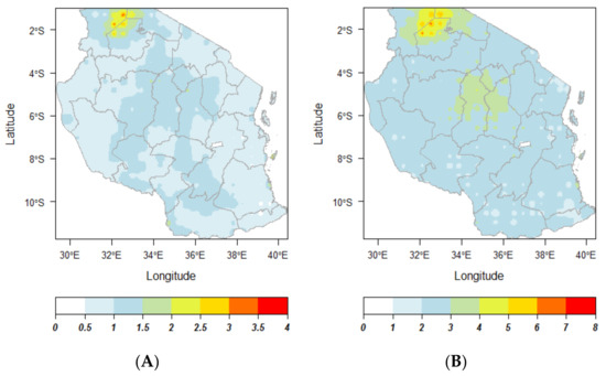 Tanzania is a tropical country located 50 km south of the equator. The climate varies substantially across regions, influenced by complex relief features [72]. Temperatures vary with the geographic location and altitude and are usually higher during the dry seasons between October and March [46] and are coolest during the months of June and July. The migration of the Inter-Tropical Convergence Zone (ITCZ) causes the Northern and Eastern regions of Tanzania to experience two distinct seasonal precipitation patterns (bimodal precipitation patterns), while the Southwestern, Central and Western parts of the country experience one precipitation season (unimodal precipitation patterns) [73,74].