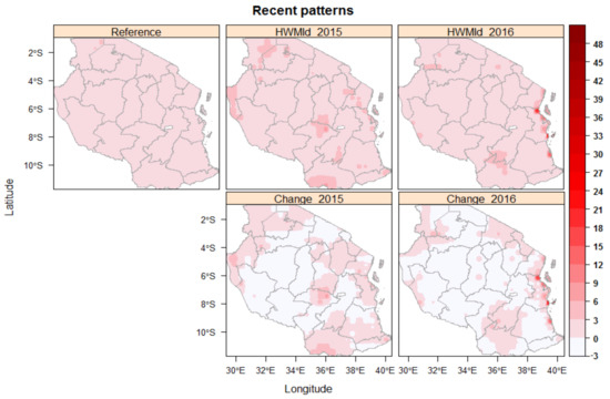 It is therefore clear that although the heatwave climatology for the reference period was rising marginally over time, the duration increased significantly in the affected areas. Since the reference period was relatively short, the 2 extra years (2015 and 2016) were reviewed for comparison with the heatwave climatology to identify spatial patterns in heatwaves in recent years. The relative changes in heatwave events in 2015 and 2016 demonstrate a sharp spatial contrast when compared with the reference heatwave climatology. Normal heatwaves that occurred in Kigoma, Katavi, and eastern Tanzania during the reference period became severe and extreme heatwaves in 2015/2016. Greater magnitude heatwaves appeared in various parts of the country, particularly in Dar es Salaam, eastern Tanzania, and the edges of the country.