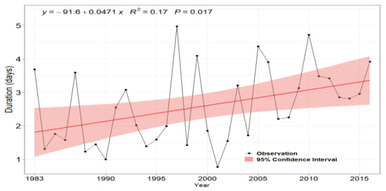 Temporal trends in the mean severity of heatwaves during the reference period were not statistically significant at the 5% level, although significant trends were detected in patchy areas that recorded higher heatwave magnitudes. The significance of HWMId for the reference period is therefore not reported here. However, the duration of heatwaves for the entire observed period (1983–2016) exhibited significant rising trends but with high variability, ranging from about 1 to 5 days (Figure 3). It can be seen that the year 1999 witnessed the most deadly heatwave magnitude during the observation period; however, the longest heatwave event of about 5 days occurred in the year 1997.
