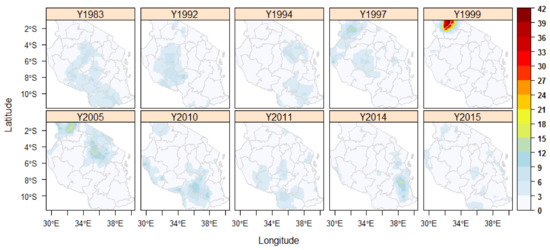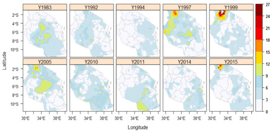 The heatwave ranking method adopted by [70] was similarly used to select the 10 years with the most extreme heatwave events. The selection was based on the percentage of Tanzania’s area affected by the heatwave at different HWMId levels and the magnitude of the HWMId peak. For example, given two heatwaves, HW1 and HW2, HW1 would be greater than HW2 if the percent area across all HWMId levels is greater than that of HW2. However, due to high variability in the ranking across the HWMId levels, the selection was largely based on the HWMId peak value.