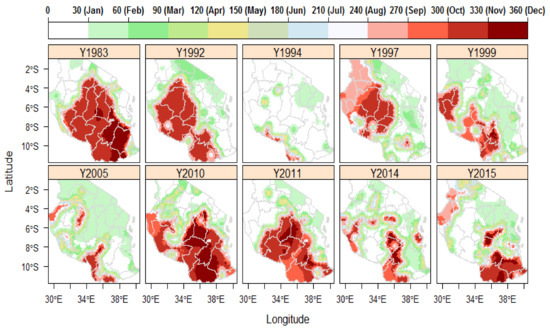 The spatial extent of these lethal heatwaves affected at least 15% of the total land area of Tanzania in each of these years (Table 3). However, the percentage of land area affected decreased with the higher magnitude heatwaves. The heatwave duration had similar pattern to the HWMId. Parts of the Lake Victoria basin, which recorded the highest HWMId peak value in 1999, also experienced the longest duration (duration > 25 days) at a fine spatial scale (Figure 5). The starting date of the heatwave events mainly coincided with the dry season (October to March/April) (Figure 6). However, a few heatwave events occurred in the other months.