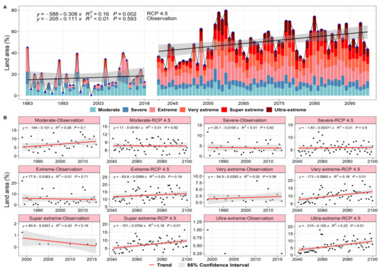 Temporal evolution of land area ratio, expressed in percentages: (A) trends of the land area ratio, (B) regression analysis of the various heatwave categories that occurred in Tanzania from 1983–2100.