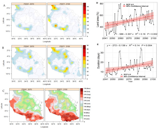 Projected changes of heatwave events in the 21st century (A) with their corresponding duration (B) and starting dates (C) averaged over Tanzania. Graph (D) represents the land area ratio (E) shows trends of the heatwave events that occurred in Figure 8A.