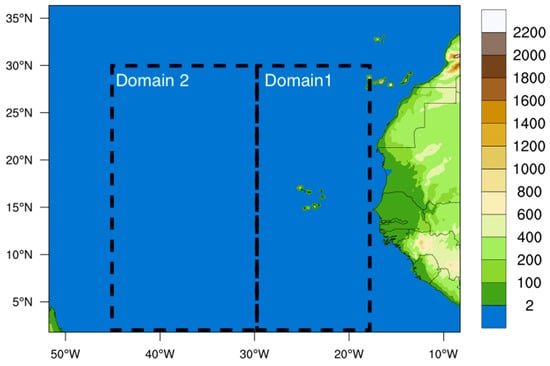 Tropical cyclones were selected with genesis processes through dust outbreaks during 2015–2018, including Florence (2018), Irma (2017), Fiona (2016), Gaston (2016), Lisa (2016), Matthew (2016), Danny (2015), and Grace (2015). The study region was divided into two domains to classify the TC formation location. As shown in Figure 1, domain 1 was defined between 18° W to 30° W while domain 2 was bounded between 45° W to 30° W. Splitting the region into two domains helps determine not only the propagation of the tropical cyclone concerning the dust outbreak but also the extent of other factors (i.e., SST, and wind shear) that play into the genesis of TCs. Generally, domain 1 presents relatively lower SST, wind-shear, and RH. In comparison, domain 2, which encompasses a large part of the main development region for TCs, reveals more favorable conditions for development. All TC cases went through genesis in domains 1 and 2 except for Matthew (2016) which developed outside of domain 2.