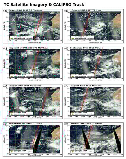TERRA/MODIS visual satellite imagery obtained from NASA Worldview. The red line represents CALIPSO Satellite track on the given satellite imagery date. (a) Florence, (b) Irma, (c) Matthew, (d) Lisa, (e) Gaston, (f) Fiona, (g) Grace, and (h) Danny.
