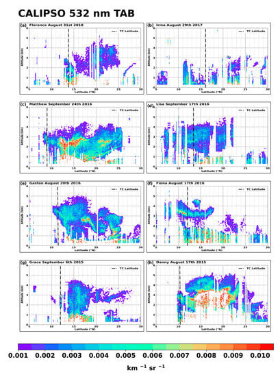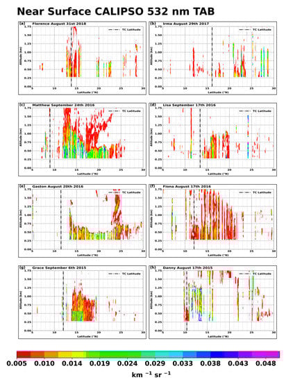 Satellite data from the NASA Terra/MODIS were used to examine spatial variability in dust outbreak events. NASA’s Cloud-Aerosol Lidar with Orthogonal Polarization (CALIOP) onboard the CALIPSO Satellite was employed to evaluate vertical profiles of atmospheric aerosols. Figure 2 shows the eight TCs and the overpass location of CALIPSO. The Total Attenuated Backscatter (TAB) at wavelength 532 nm measured by CALIOP Lidar was the main parameter analyzed []. TAB is defined as the signal received by the satellite that measures the backscatter of the lidar signal by molecules and particles in the atmosphere (Kar et al., 2018) []. In this study, TAB is used to illustrate the vertical distribution and magnitude of the aerosol concentration around the TC-genesis region. Filters such as the Cloud-Aerosol Distribution Score (CAD Score), Cloud Layer Fraction (CLF), and 532 nm Quality Flag (QC) are applied to reduce cloud interference and other contaminating features in the vertical profile. The CAD Score uses a confidence function to discriminate between clouds and aerosols based on their optical and physical properties (Liu et al., 2009) []. CAD > 90% was selected to omit the cloud interference on aerosol signatures. The CLF is used to obtain a cloud clearing fractional distribution of backscatter in each bin for aerosol backscatter. In each 5 km profile bin there are 30 single shot cloud layers. To omit ambiguous aerosol data that would misclassify an aerosol layer as a cloud layer, the CLF was set to reject anything greater than 28 for each bin. The 532 nm Quality Flag Extinction (QFE) is another layer of filtering that can assess the aerosols for quality analysis. Young and Vaughan (2018) [] suggest that night retrievals are higher quality than daytime retrievals; therefore, a constraint of QC = 16 is implemented to identify the totally attenuating and opaque features. This additional constraint refines the data quality and cloud/noise interference. In this study, TAB restraints from 1.0 × 10−3 km−1sr−1 through 1.0 × 10−2 km−1sr−1 are chosen to depict an aerosol threshold. The QC flag and CLF cleans the concentration levels where we see higher signatures that could be false, and the CAD score used in the algorithm eliminates contaminated features that have a 90% confidence level of being clouds.