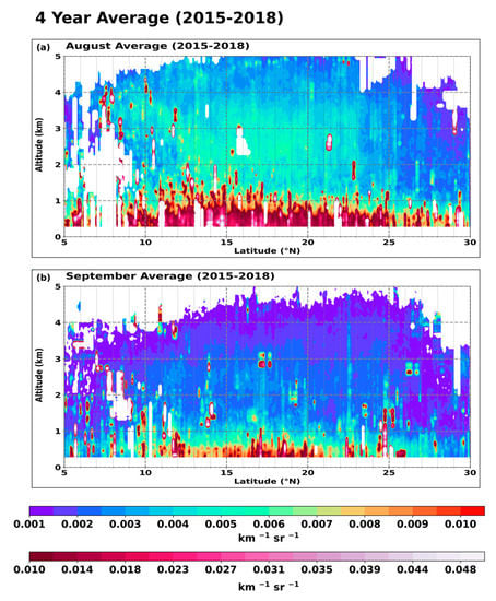 CALIPSO Satellite 532 nm Attenuated Backscatter plot from surface to 5 km altitude for (a) August, and (b) September average from (2015–2018). The black dashed line represents the AEW/TC location in latitude. There are two thresholds set, first to 0.001–0.01 km−1sr−1 and secondly, 0.01–0.05 km−1sr−1 to detect the higher near surface TAB.