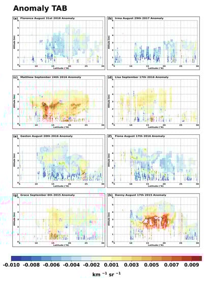 CALIPSO Satellite 532 nm Attenuated Backscatter anomaly plot from surface to 1.756 km altitude. Threshold set to −0.01–0.01 km−1sr−1. (a) Florence, (b) Irma, (c) Matthew, (d) Lisa, (e) Gaston, (f) Fiona, (g) Grace, and (h) Danny.