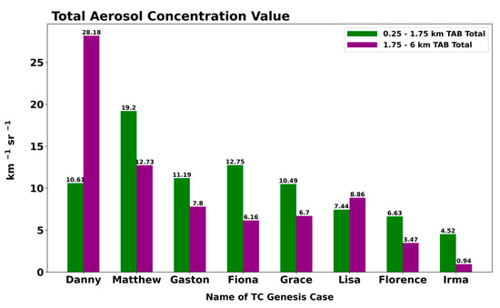 The accumulated TAB for both Danny and Matthew had the highest total of TAB concentration amongst all the cases between 30–40 km−1sr−1 (Figure 7). One major difference between Matthew and Danny is the location of the highest aerosol concentration. As seen from Figure 6c,h, Danny observed a maximum positive anomaly primary between 2–3.5 km above sea level while, Matthew observed a maximum positive anomaly at both 0.5–1 km and 2–3 km above sea level. This result may explain why the genesis did not take place in domain 1. However, other environmental factors could have limited the process of genesis to occur rather than the dust aerosols themselves.