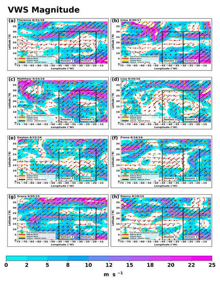Additionally, the wind shear environment revealed a reoccurring condition which existed within newly formed TCs. For example, Fiona (2016) went through genesis under favorable conditions but started to make its way towards a more shear prone environment within 24 h (Figure 8f). Matthew (2016) was also in a favorable area on the 23rd of September; however, the flow near the surface (red arrows) was weak, preventing the wave from consolidating and going through genesis (Figure 8c). Moving forward in time, the directional shear environment within the 250–850 hPa increases, and conditions become unfavorable as the system propagates through domain 2. Grace (2015) has a belt of windshear from 8~15 ms−1 engulfing the 20° N–25° N region for both domain 1 and 2 (Figure 8g). This shear flow pattern likely kept Grace from advecting northward during the genesis process while an area of dry air was present in that region. Additionally, Gaston (2016) revealed that the storm induced shear of approximately 10 ms−1 was likely due to the broader circulation becoming more organized towards its center amongst a gyre of convergence (Figure 8e). Moreover, Florence and Irma had a very similar magnitude of shear associated with the system with the addition of a belt of shear lying ahead in domain 2 for about 5~12 ms−1 (Figure 8a,b). An interesting feature to note is the wavelike crest feature seen ahead of the location of genesis, indicating a favorable environment for intensification (Figure 8a,b).