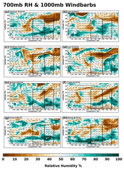 The relative humidity (RH) at the 700 hPa level was critical to the analysis due to its representation of the SAL location in the domain regions. Figure 9 displays 700 hPa RH overlayed with the 1000 hPa winds. All events showed prominent signs of an easterly and northeasterly dry airflow in domain 1 (Figure 9). The results suggest that drier air is being engulfed from the African continent into the domain’s development region. Additionally, dry air, in most cases, is also associated with dust aerosols embedded within the SAL. This inference can be made with the combination of factors shown in Figure 3, Figure 9 and Figure 10. Florence and Irma were broad circulating AEW’s with moisture consolidating in all quadrants of the system during genesis (Figure 9a,b). Lisa, Gaston, and Fiona show the dry air intruding into the system’s west and southwest quadrants (Figure 9d–f). Most of the cases had a favorable environment for development with a relative humidity at 700 hPa between 70 and 90%.