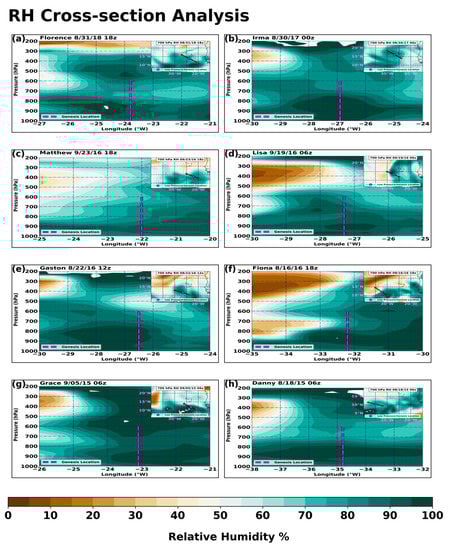The cross-section analyses for RH illustrate a spatial representation in the horizontal and vertical direction of the atmosphere (Figure 10). For Matthew, Lisa, Fiona, and Grace the dry air intrusion is approximately 1 degree from the center’s location (Figure 10c,d,f,g). Furthermore, Florence, Irma, and Danny see some extent of SAL coming into play by a difference of only 2 degrees longitude (Figure 10a,b,h). Additionally, Fiona (2016) had the highest contrast of dryness as RH dropped to 35% with less than a degree distance from the genesis location (Figure 10f). Moreover, there were signs of a distinct layer of moisture at the 900 hPa level at the center of the genesis location with drier air intruding aloft at 700 hPa (Figure 10f).