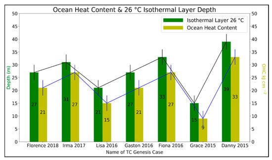 Observed results suggest the majority of the cases went through genesis in a 28–29 °C SST environment. In general, sea surface temperature anomalies (SSTA) were normally above average in the genesis region. Based on these observations, the surface environment was conducive for TC genesis to occur. However, an important understanding of the transfer of energy also needs to be evaluated during the time of genesis by the OHC (Figure 11). By understanding the SSTA to be above average, TC Matthew was not included in Figure 11 due circumstances that led to genesis not taking place.