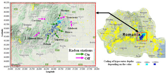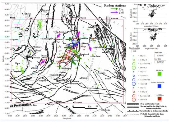 The geological structure of the studied area represented the starting point in establishing the monitoring locations. There are three seismic nest regions characterized by strong heterogeneities: Vrancea (Romania), Bucaramanga (Colombia), and Hindu Kush (Afghanistan) [,,]. In our case the faults and seismicity are presented in Figure 2. The active radon monitoring stations are represented by green arrows, and the deactivated ones by red (also shown in Figure 1). Table 1 shows the situation of radon monitoring by NIEP. Although the monitoring stations were positioned on the faults, there were not always results. For this reason, some measurement points were used and the equipment was reallocated. In some cases there were only radon evaluation campaigns, such as at the Chiurus, Agigea, and Magurele stations (the last two are not in the Vrancea area). We also chose a reference location for radon monitoring in a less seismic area, Râmnicu Vâlcea RMGVdd, where the detector was positioned near a borehole in a specially arranged space []. The first tests were performed by positioning the radon detector in the ground, at a depth of 1 m in an enclosed space. Another attempt was made in the seismic monitoring tunnel at Muntele Rosu, where the humidity is very high, but it is ventilated. In both cases the results were inconclusive, with radon variations having a random character. The equipment used (Table 1) allows the measurement of radon emissions indoors. In all cases the location was closed but not sealed, so it can access the outside air. This solution was preferred, because it is difficult to find a position exactly at the point where the radon emission is most accentuated. However, the positioning of the stations was in fault areas, and each location also has a weather station that measures the direction and speed of the wind. For this reason, there are sometimes radon peaks that we filter. In Table 2, the high values of radon are peaks. Positioning the sensors is a difficult task, which requires testing and time. An example of a location is Plostina (Table 1), where the equipment is in a 0.5 m pit with access to the outside air through a cable channel. Our solution is similar to the one presented in IRON [].