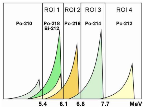 Table 1 shows the monitoring stations and equipment used and Table 2 the performance of this network. There are generally two manufacturers and three types of equipment: SARAD with Radon Scout and Radon Scout PLUS, and ALGADE with AER + C. The SARAD equipment differs less in hardware (the radon detection part is the same, there are differences in power supply and memory size) but more in firmware. An important difference is the inclusion in the data of the ROI1 (region of interest) value. Nuclide separation by α spectroscopy is presented in Figure 3.