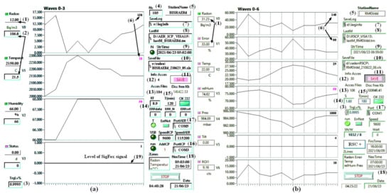 For the three types of equipment used (Table 1), applications were made to retrieve the data, display them, save them, transmit them in real time, and warn in case of exceeding predetermined thresholds. Figure 5 shows the panels of the data acquisition programs from AER + C (a) and Radon Scout Plus (b). The software for Radon Scout is similar to panel (b) without indication of atmospheric pressure, but the communication protocol is different.