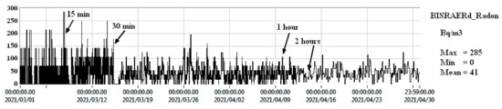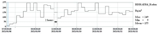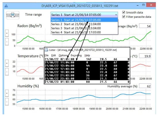From the analysis of the data provided by the AER + C equipment produced by ALGADE we found that there are gaps. This is normal, because the internal software sometimes restarts data acquisition and marks this with “Series Start at”. In Figure 10, which represents the data displayed by the AER + C software, we also superimposed the content of the corresponding data file (“Lister—[d:\file.name”]), marking the discontinuities with a black background. The gaps are completed by adding the last recorded value. In the case of the Radon Scout Plus equipment we did not record gaps in data (the analysis was made over a period of 5 years), but we found a difference between the data read from the equipment in the converted form, from binary to real values, and those processed by its software offline. This was the result of rounding from real numbers to integers.