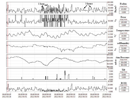 The SARAD software will determine the measurement error from the data saved in its internal memory, which is less when choosing a sampling time of 3 h. Figure 7 graphically shows the data provided by the SARAD Radon Vision 6 program. The SARAD application note AN_007_RadonBasics_PPT_EN_11-04-08.pdf explains more details about nuclide separation by α spectroscopy (Figure 3), and in []) also determines the radon and the error. By selecting the sampling time of 1 h, we have a faster response, but also larger errors.