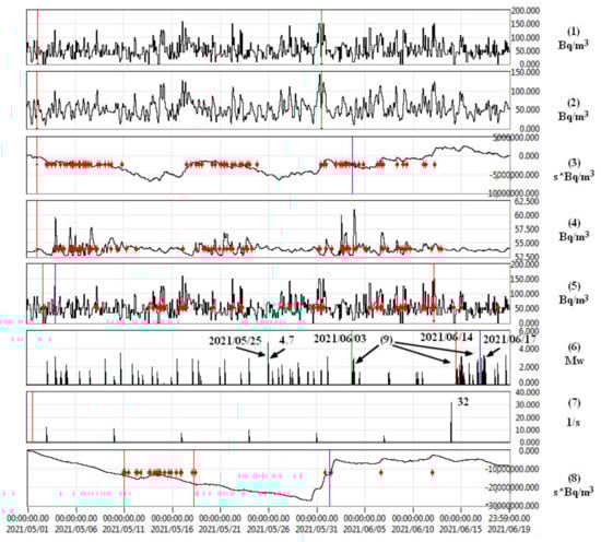 The processing methods were described in our articles [,]. Figure 9 is an example of how seismic activity correlates with radon emission. We used the data from the Bisoca station, where an AER + C is installed.