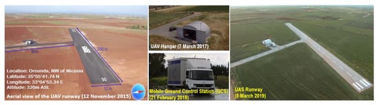 The USRL airfield consists of two interconnected paved runways, a hangar, and reserved overhead airspace (Figure 1). The main runway (300° orientation) is 200 m long and 12 m wide, whereas the secondary runway (0° orientation) is 90 m long and 6 m wide. The USRL exclusive overhead airspace, granted by the Department of Civil Aviation (DCA) of Cyprus under a permanently renewable NOTAM (NOTice for AirMen) status, has a diameter of 1 km and a ceiling up to 3.5 km AGL. Special permission is required for flights above 3.5 km AGL. Adjacent to the USRL permanent airspace, an extended 16 km2 airspace up to 2.5 km altitude is available upon request to the Cyprus DCA and can be used to perform specific UAV flight plans with straight-line course at different altitudes.