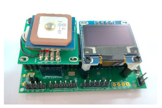 A variety of data acquisition (DAQ) systems based on small micro-controllers and single-board miniaturized computers have been designed and developed to communicate with several scientific instruments (e.g., MetOne 212 OPC, Personal Ozone Monitor (POM), Filter sampling, MicroAeth AE51, Multi-sample PEAC, etc.). In addition, custom-made GCS [29] that can remotely control and monitor the on-board DAQ system visualizing in real-time all the scientific instruments on-board the UAV has been lately re-designed around a standalone miniaturized microcontroller based on an ARM processor. The novel DAQ system (Figure 3), which is significantly improved in terms of volume with (7 cm × 3.6 cm × 2.6 cm), weight (34 g), cost and power consumption can work in a standalone mode as it includes its own micro-GPS sensor and power supply. It can also be easily interfaced with the A/P system as described above.