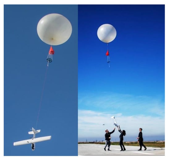 High-altitude atmospheric measurements in the upper troposphere and lower stratosphere (up to 15 km) above the Eastern Mediterranean is of particular interest since African dust layers up to 8 km altitude can be observed over Cyprus [30]. The updraft of air pollution from Asia during the monsoon period, the long-range transport of this pollution and its subsidence over the Eastern Mediterranean [31] is another motivation to profile the atmospheric column above Cyprus at higher altitudes. The current fleet (see Table 2) has a maximum altitude of 4 km. For the characterization of higher atmospheric layers such as the upper troposphere or lower stratosphere (up to 15 km altitude), large-size manned or unmanned aircraft are being used. However, such research aircrafts are costly and often not feasible for routine observations. Meteorological balloons carrying sensors can offer an interesting alternative with, nevertheless, some limitations when it comes to recovering the sensors. To account for these limitations, a UAS-balloon system is currently being developed at USRL (Figure 4), which is a fixed-wing UAS that can be launched up to the lower stratosphere with the aid of a meteorological balloon. UAS-balloon systems have been reported by Kräuchi and Philipona [32] for radiation profiles but, to the best of our knowledge, no studies reported so far have used UAS-balloon systems for gas/aerosol measurements.