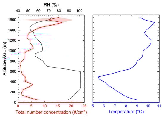 Ascent profiles of total particle number concentration obtained by the Alphasense OPC-N2 on-board the UAV on 24 September 2017 during PaCE field experiment in Finland. Red shaded area refers to the standard deviation of the measurements (per 20 m).