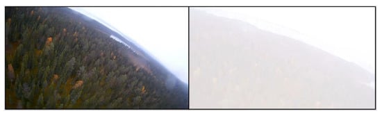 Pictures obtained from video recording on-board the UAV on 24 September 2017 during PaCE field experiment in Finland. Left panel shows a picture right before the UAV entered the cloud at 300 m AGL altitude, while right panel shows a picture when the UAV was flying inside the cloud.