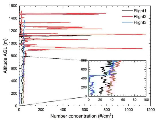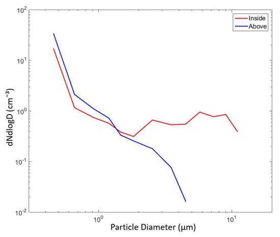 Results from the aerosol profiling carried out with the modified Alphasense OPC-N2 on-board a UAV profiling on 24 September 2017 are presented here. Figure 5 shows ascent profiles of total particle number concentration in the diameter range from 0.38 to 17.5 μm, as measured by the Alphasense OPC and the corresponding meteorological profiles of air temperature and relative humidity. The total number concentration varies between 1 and 10 cm−3 from the surface up to 1300 m altitude, whereas at the uppermost layer (1500–1600 m altitude), the number concentration gradually increases up to 18 cm−3. RH reaches a value of 100% between 200 and 600 m AGL, indicating low-level clouds as confirmed by the video recording. This 400 m height cloud layer is also characterized by a gradual decline of temperature from +7 °C at the cloud base to about +5 °C at 500 m altitude, where a temperature inversion has occurred. The right panel of Figure 6 shows a picture taken by the camera on-board the UAV when the UAV was flying inside the cloud, whereas the left panel shows a picture taken when the UAV exited the cloud base. Figure 7 shows the averaged particle number size distributions of aerosols inside the cloud (between 200 and 600 m AGL) and above the cloud layer. Differences observed in the aerosol size distribution inside/above the cloud clearly indicate the capacity of the UAV to collect and measure cloud droplets, detected here above 2–3 µm diameter. Interestingly, submicron (cloud droplet interstitial) aerosols can also be detected within the cloud.