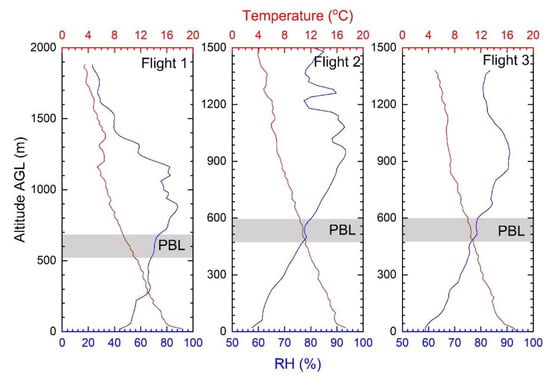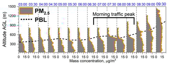 Figure 8 shows the vertical distribution of fine particulate pollution for each of the 15 individual flights. The PBL height (derived from the temperature inversion measured by the UAV T/RH sensor) is reported in black dashed line and shows a stable altitude, around 500 m AGL, from 0500 LT until 1030 LT, and steeply increase until the end of the UAV profiling (1230 LT). The sunrise in Nicosia on that day was at 0618 LT. In the first hours (before the morning traffic peak), the typical PM2.5 profile shows a gradual decrease from ca. 15 μg/m3 close to the surface to values close to 5 μg/m3 at 500 m AGL when crossing the PBL. PM concentrations were remaining stable and below 5 μg/m3 above the PBL. The morning traffic-peak is evidenced from PM at 0830 LT with high PM integrated concentrations observed until 0930–1000. PM distribution during the morning traffic rush hours is in the range 15–25 µg/m3 and homogeneously distributed in the first 500 m (i.e., no clear gradual decrease in this altitude range) with again a sharp decrease below 5 μg/m3 when crossing the PBL at 500 m AGL. Interestingly, the development of PBL (from 1030 LT) does not seem to affect the PM vertical distribution, which seems to dilute homogeneously within the boundary layer. These preliminary results differ from those we obtained from equivalent black carbon concentration over Athens and Milano [10,62], which have reported a much less homogenous vertical dispersion of traffic emissions, and therefore highlighting the need for further and more systematic UAV-based aerosol profiling over urban areas.