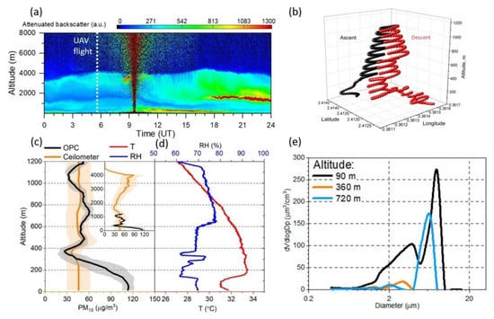 (a) Attenuated backscatter at 1064 nm as measured by the CHM15k ceilometer on 9 July 2017 transect during the AQABA campaign; the dotted white line marks the time of the UAV flight, (b) ascending and descending UAV flights tracks, (c) PM10 concentration profiles as measured by the OPC-N2 during the UAV ascending flight (black) and derived from ceilometer measurements (orange); the shaded areas denote the corresponding uncertainties and the insert figure represents the complete PM10 profile as derived from ceilometer measurements, (d) temperature, T (red) and relative humidity, RH (blue) profiles as measured by the sensors mounted on the UAV and (e) volume size distributions at 90 m, 360 m and 720 m altitude as measured by the OPC-N2 during the UAV ascending flight.