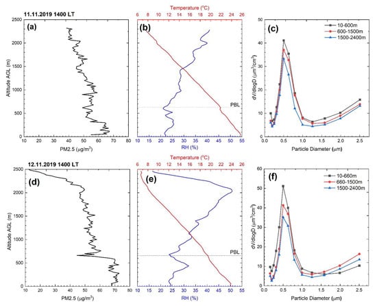 In the framework of the AQ-SERVE (Air Quality Services for a Cleaner Air in Cyprus) project, USRL developed a novel UAS based on an automated lightweight (Tarot 650) quadcopter and optimized it for the acquisition of dense (every 30 min) vertical profiles over continuous monitoring periods of several hours measuring particle size distributions and mass concentrations (PM) up to 1.5 km AGL. Airborne PM measurements were obtained by an OPC-N2, which was attached with a dryer. The objective of this campaign was to demonstrate the capacity of UAS to perform a continuous dense scanning of PM in the first hundred meters of the atmosphere where ground-based remote sensing techniques (e.g., lidar, ceilometer) often fail to perform accurate measurements. The date and time of the campaign were chosen so as to (i) enable crossing the PBL (typical low during winter) and reach free tropospheric conditions, (ii) capture the traffic-induced morning PM pollution peak and (iii) investigate the vertical dispersion of ground-based emissions along with the diurnal development of the PBL. To the best of our knowledge, this is the first time that such dense (20-min time resolution) in-situ vertical profiling of PM is performed using UAS. The small size and weight of the quadcopter (Figure S4), along with its large take-off weight-to-payload ratio (which is 3:1, without the power source), makes it an easy, cost-effective, and low-risk system to operate for narrow air-spaces within urban environments. The performance of this UAS was successfully tested during winter 2019–2020 over Nicosia with intensive (up to 15) vertical profiles of PM2.5 up to an altitude of 1500 m AGL to characterize particulate pollution within and above the PBL. The intensive profiling was conducted on a small launching pad (15 m × 15 m) next to the CyI premises, a residential (urban background) area of Nicosia. Measurements started at 0300 UTC (0500 local time, LT) and lasted 8 h with clear-sky (cloud-free) conditions. The duration of each flight was typically 15–25 min (up and down) with a ceiling set at 800 m AGL in the first hours and up to 1500 m AGL at the end of the profiling survey in order to reach the PBL and free tropospheric PM measurements. About 10 min were needed between each flight to (1) download the OPC data, (2) condition the silica gel dryer upstream the OPC in order to maintain its drying efficiency, and (3) change the battery of the UAV. Aerosol number concentration of the OPC size bins below 2.5 µm diameter were aggregated and converted into mass concentration.