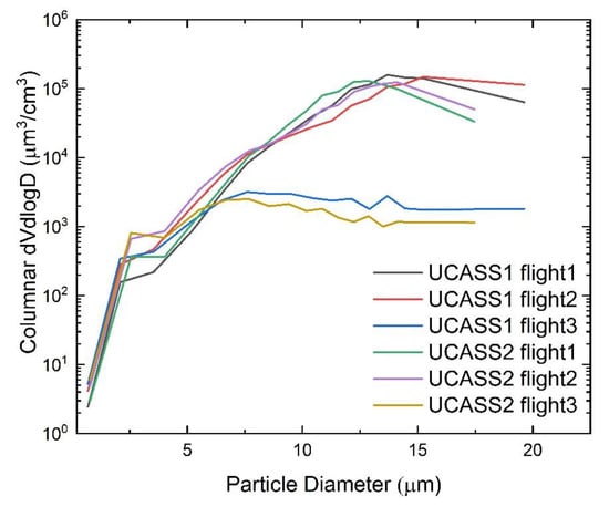 UCASS: The Universal Cloud and Aerosol Sounding System (UCASS) is a lightweight (~230 g) OPC that was designed for use as a balloon-borne instrument, as a dropsonde, or on-board UAVs [36,37]. The UCASS operates a 658-nm laser diode. Depending on the configuration mode and the laboratory calibration, UCASS can measure either aerosols in the diameter (optical) range between 0.4 and 17.0 μm or cloud droplets in the detection range from 1.0 to 40.0 μm. UCASS airborne particle size distributions and number concentrations were found to be in close resemblance with other reference OPCs on-board the DLR Falcon manned research aircraft [30]. The UCASS DAQ system is the same as the one of OPC-N2 described above.