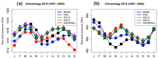 For the analysis of the atmospheric pressure and SAM climatological fields, the time interval from January/1957 to December/2005 was adopted as the reference period due to its correspondence to the available Marshall index time interval. To all datasets, we averaged the MSLP annual cycle over 40 °S and 65 °S that are the SAM GW99 index latitudes (Figure 1). In the 40 °S latitude belt (Figure 1a), the MSLP presents values higher than 1013 hPa when compared with the 65 °S latitude belt (Figure 1b). At the 40 °S belt (Figure 1a), all datasets present a similar annual pattern, with the major MSLP peak occurring in March-April. However, reanalysis (green and purple triangles) and models (BESM, black squares; CMIP5 ensemble mean, blue diamonds) present a 1–2 months delay in respect to observations for the second MSLP peak. MSLP minima higher than observations occurred during austral summer and winter (Marshall index, red circles), except for the CMIP5 Ensemble mean (blue diamonds).