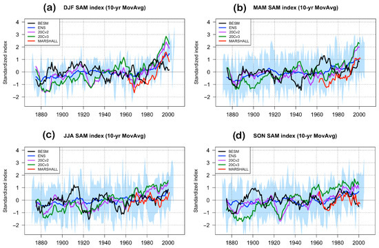 Previous studies found the highest positive trend during austral winter in the NCAR reanalysis, and during austral summer for Marshall’s index [7]. A positive trend starting in the 1970s is observed in the Marshall index time series (red lines) in austral summer (Figure 2a) and autumn (Figure 2b). BESM index (black line) is the only one that does not follow the DJF trend (Figure 2a), although it follows the MAM reconstructions (Figure 2b). During JJA (Figure 2c), the positive trend is not clear in observations (red line), CMIP5 models (blue line), and BESM (black line), but very noticeable in reanalysis data (green and purple lines). Reanalysis data (green and purple lines) and CMIP5 models outputs (blue line) also show a positive trend during austral spring (SON). BESM (black line) outputs agree with Marshall’s index (red line) with no trend in SON (Figure 2d).