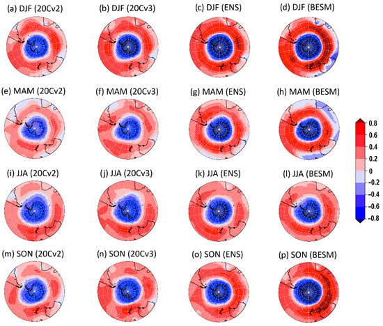 SAM GW99 index correlation with seasonal SLP anomalies. DJF: (a–d); MAM: (e–h); JJA: (i–l); SON: (m–p). First column: NOAA-20Cv2 reanalysis; second column: NOAA-20Cv3 reanalysis; third column: CMIP5 ensemble mean; and fourth column: BESM. Reference period: 1871–2005.
