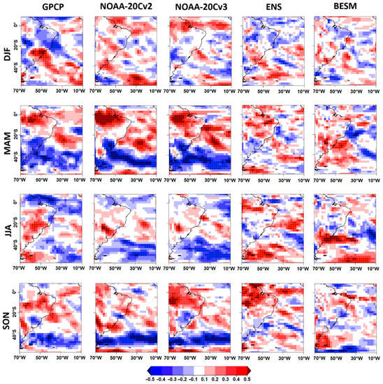 SAM index correlation with seasonal precipitation anomalies (1979–2005). Precipitation values: first column, GPCP; second column, NOAA-20Cv2 reanalysis; third column, NOAA-20Cv3 reanalysis; fourth column, CMIP5 ensemble mean; and fifth column, BESM. Lines refer to seasons: first line, December to February (DJF); second line, March to May (MAM); third line, June to August (JJA); and fourth line, September to November (SON). Dotted areas correspond to 5% significance level.