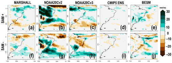 Precipitation anomalies composites according to SAM phases. (a–e), positive SAM; (f–j), negative SAM. Composites were obtained by averaging precipitation anomalies in months with SAM standardized index values higher than |2|. Precipitation values are in millimeters per month (mm/month). Datasets: (a,f), Marshall SAM index and GPCP; (b,g), NOAA-20Cv2; (c,h), NOAA-20Cv3; (d,i), CMIP5 ensemble mean; (f,j), BESM. Reference period: 1979–2005.