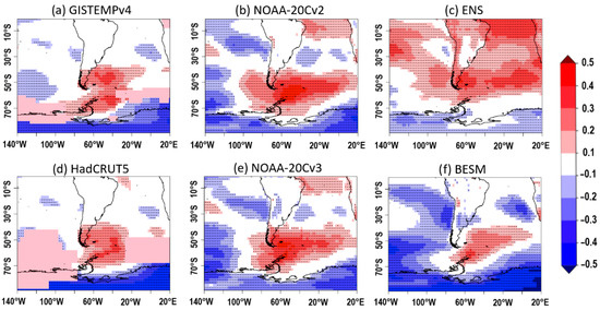 SAM index correlation with monthly surface temperature anomalies (1979–2005). (a) GISTEMPv4, (b) NOAA-20Cv2 reanalysis, (c) CMIP5 ensemble mean, (d) HadCRUT5, (e) NOAA-20Cv3 reanalysis, (f) BESM. GISTEMPv4 and HadCRUT5 temperature anomalies were correlated with Marshall observational index, while reanalysis and models’ temperature anomalies were correlated with GW99 index. Dotted areas correspond to 5% significance level.